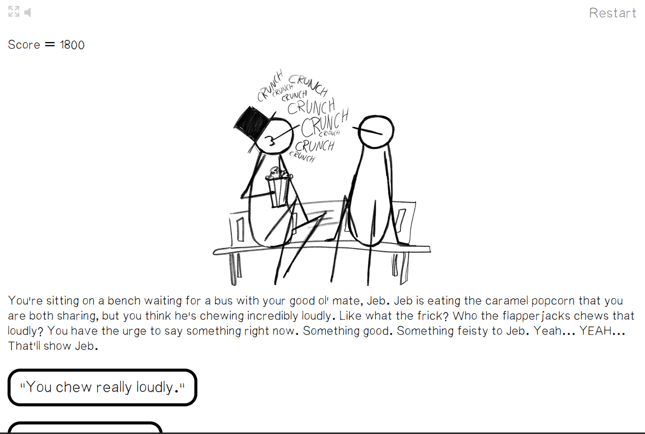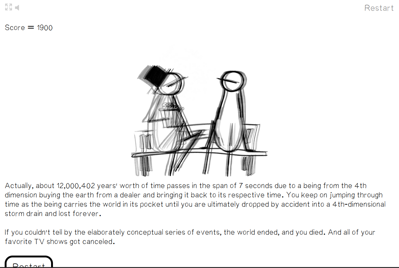 Want some quick, quirky, and fun entertainment right in the comfort of your browser? Well this might be the game for you! In this game you start off sitting with your pal Jeb with his big ol' bucket of popcorn. Unfortunately for you, the world will end, someway, somehow. It's basically an inevitability, so make the most of the situation by getting the most points via the different endings. Maybe then you could find out why the heck Jeb eats his popcorn that loudly.
