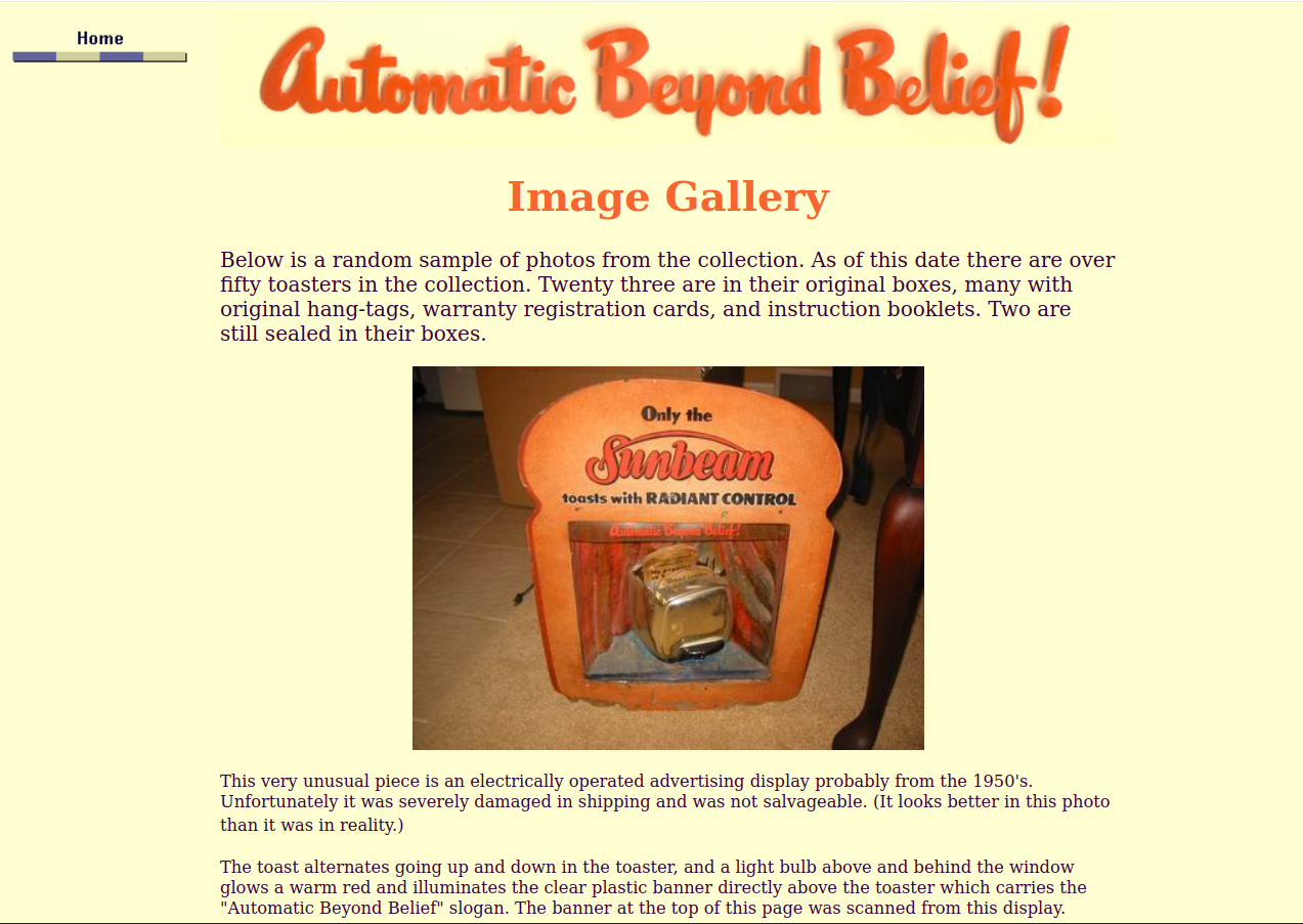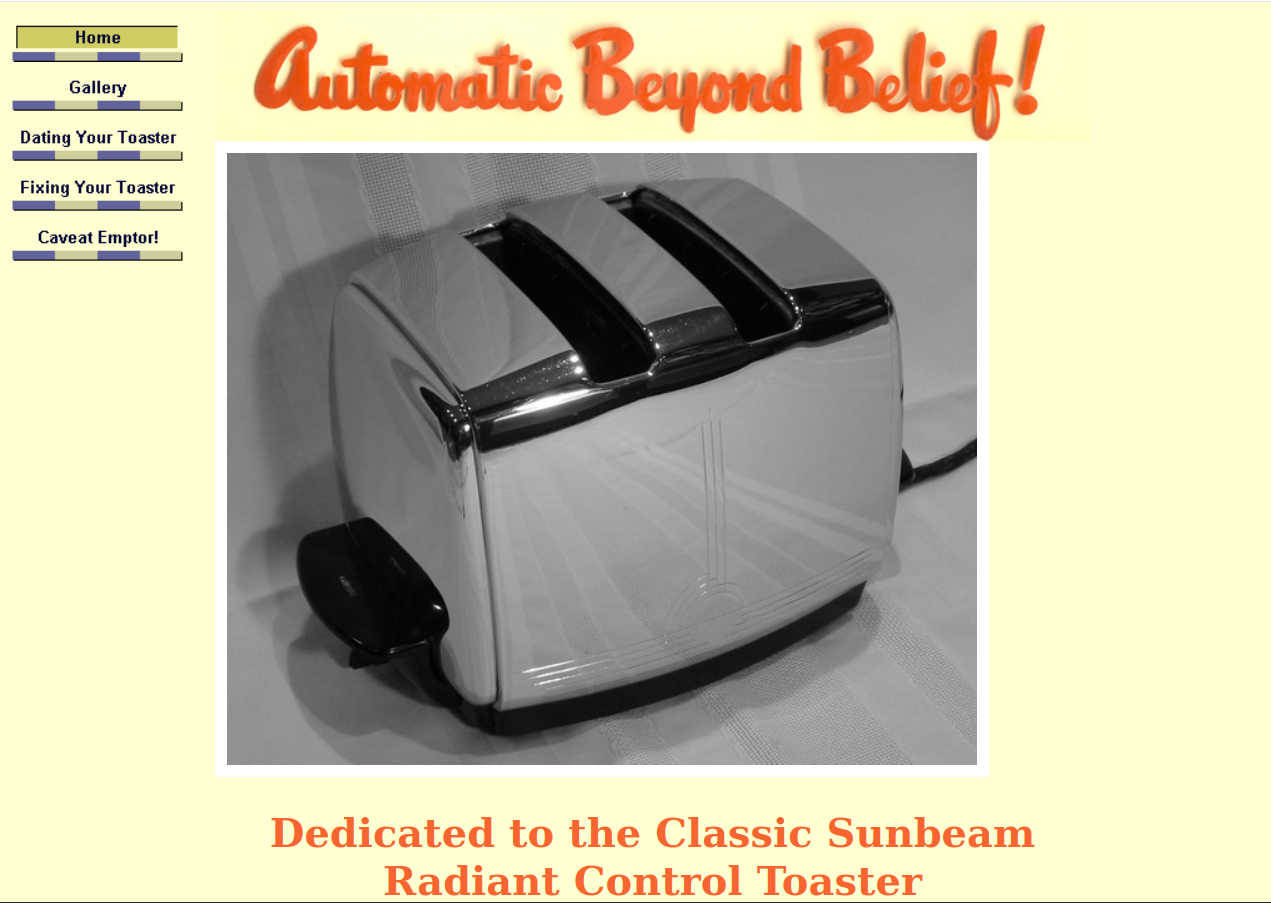 Want to know what the best toaster ever made was in 2005? No? Well here you go anyway. This site is for the most part all about the "Sunbeam Radiant Control" Toaster, which is apparently one of the best toasters ever made. And if that isn't useful to you than the toaster repair guide most certainly is.